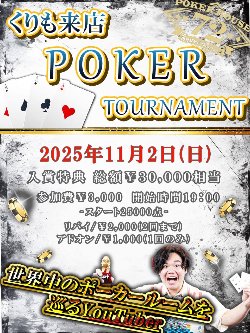 お知らせ 11/2(日)くりもさん来店イベント開催! 2025.10.20 お知らせ OPEN2日目の2025年11月2日(日)にYoutuberのくりもさんが来店します! ポーカートーナメントを開催しますので、ぜひお気軽にご参加ください♪ Post 記事のタイトルとURLをコピーする オープン日変更のお知らせ 前の記事 新着のお知らせ オープン日変更のお知らせ 2025.10.09 バイトな女子。に掲載されました! 2025.09.04 求人募集のお知らせ 2025.09.04